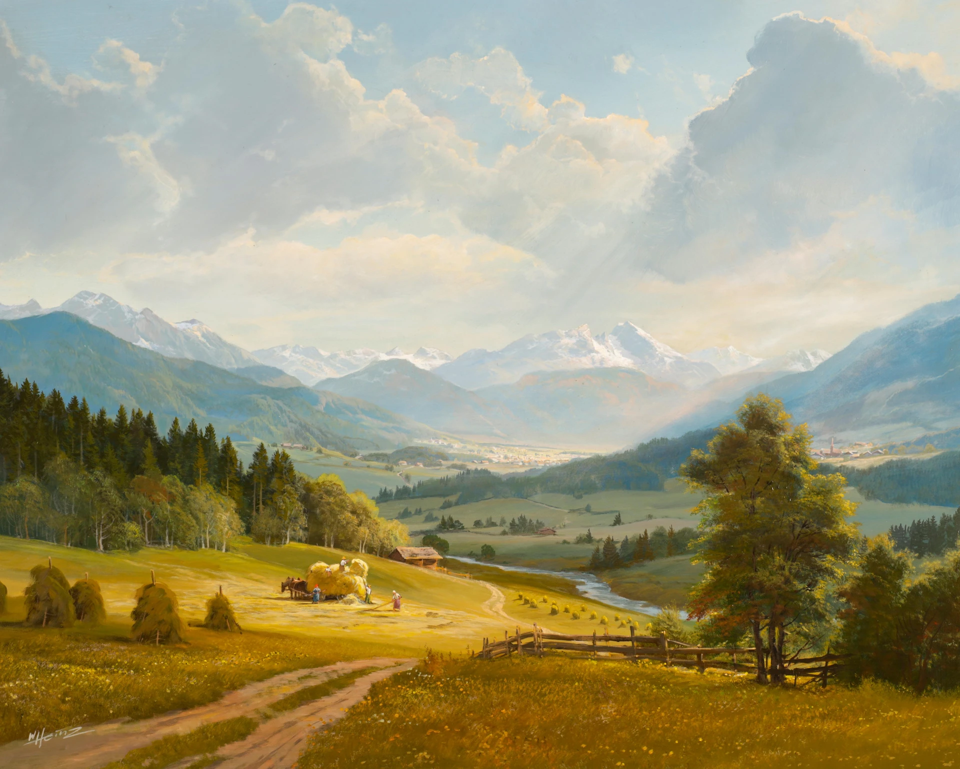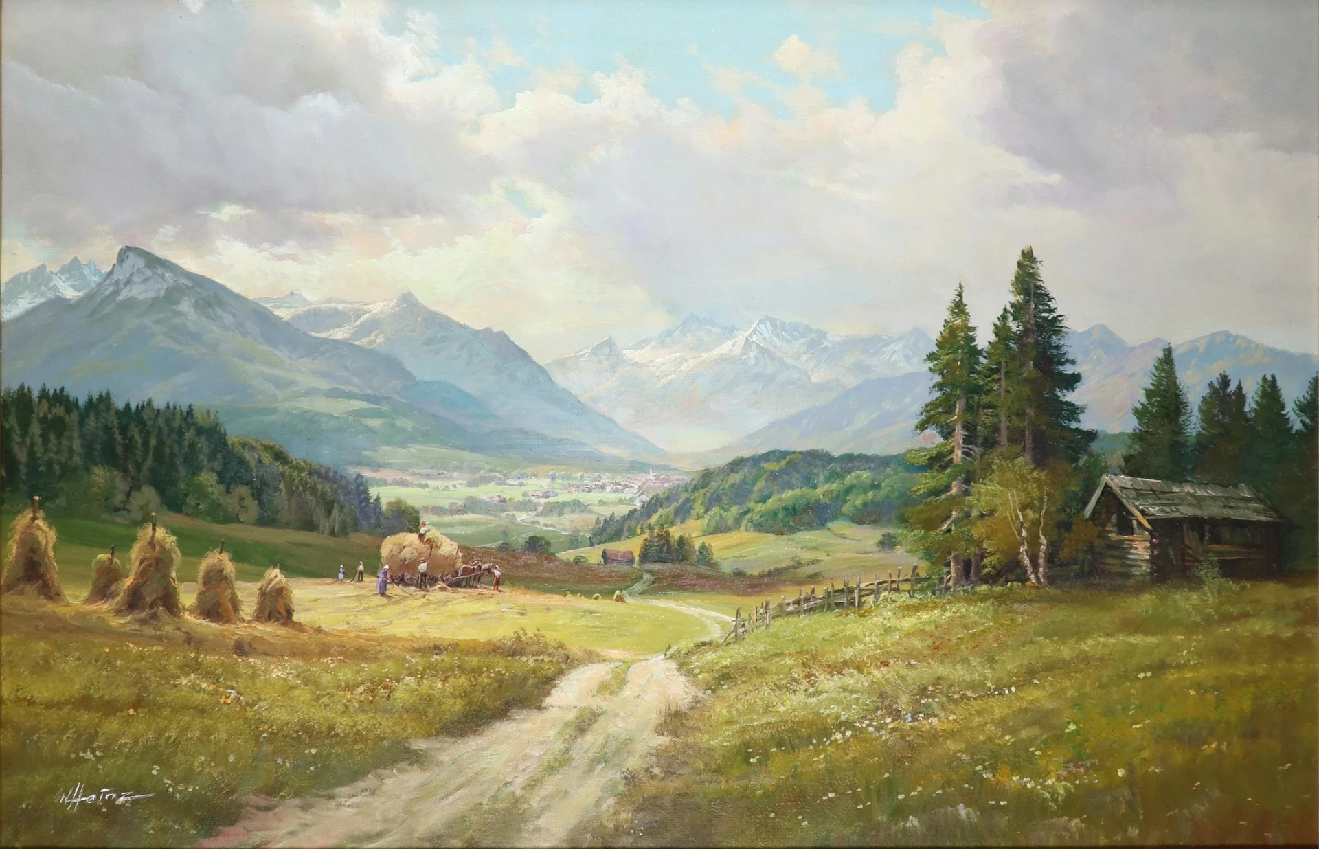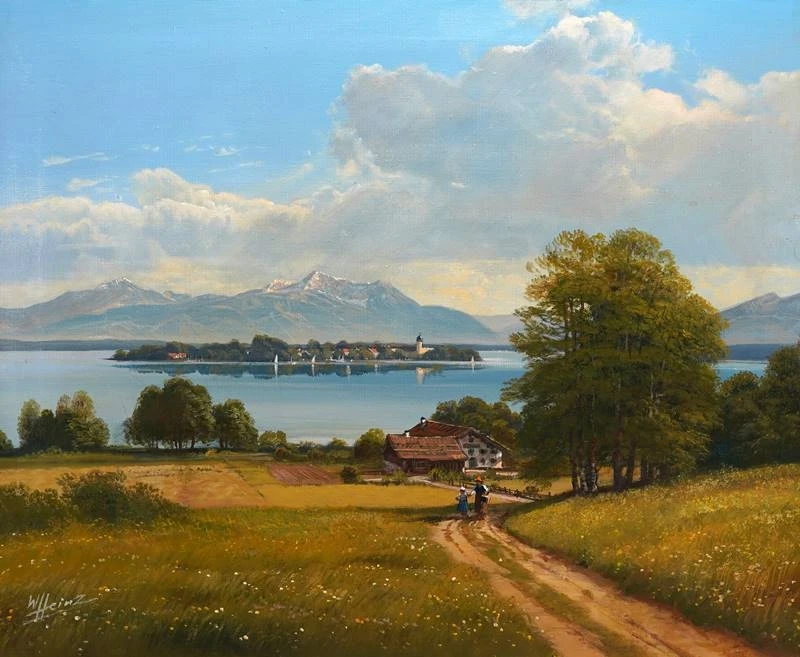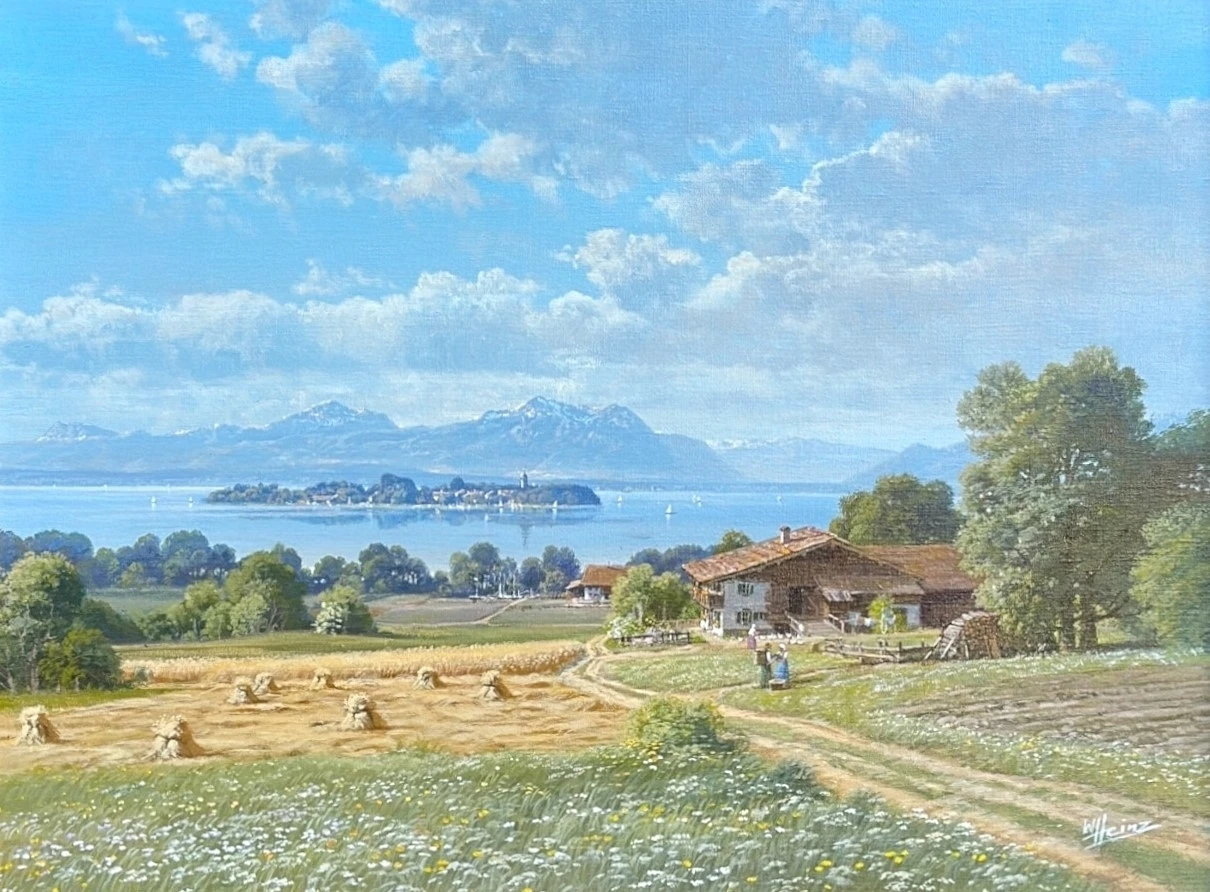 Wolfgang Heinz (German, 1930–2014) work has been offered at auction multiple times, with realized prices over $3,800 USD, depending on the size and medium of the artwork. In 2016 auction Blick auf Frauenchiemsee an einem sonnigem Sommertag, (50cm x 60xm or 23 1/2″ x 19 3/4″) sold at Sieglin Auction House in 2021 is for $1,090 USD. The painting Alpine Haymaking sold in Great Britain by 1stDibs for $3,900 USD. His largest known painting is Alpine Lake.