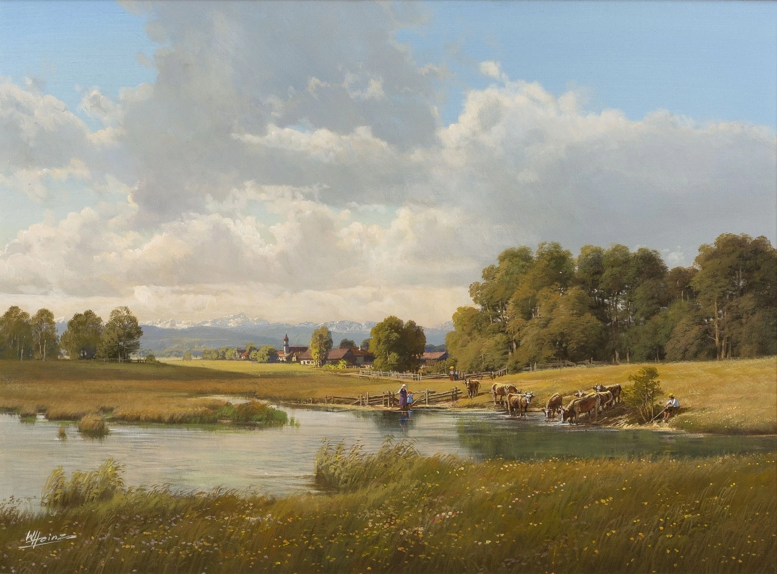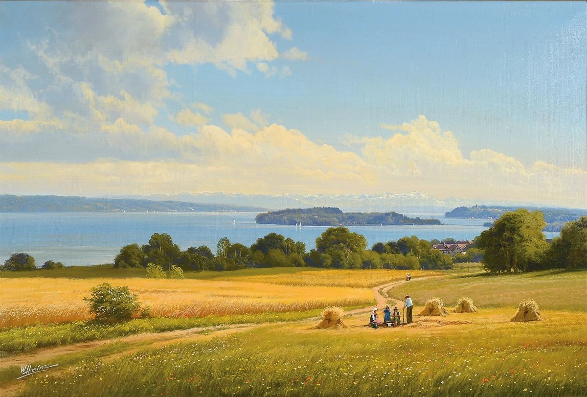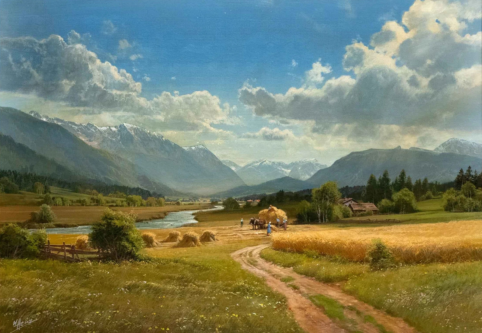 Wolfgang Heinz (German, 1930–2014) work has been offered at auction multiple times, with realized prices over $3,800 USD, depending on the size and medium of the artwork. In 2016 auction Blick auf Frauenchiemsee an einem sonnigem Sommertag, (50cm x 60xm or 23 1/2″ x 19 3/4″) sold at Sieglin Auction House in 2021 is for $1,090 USD. The painting Alpine Haymaking sold in Great Britain by 1stDibs for $3,900 USD. His largest known painting is Alpine Lake.